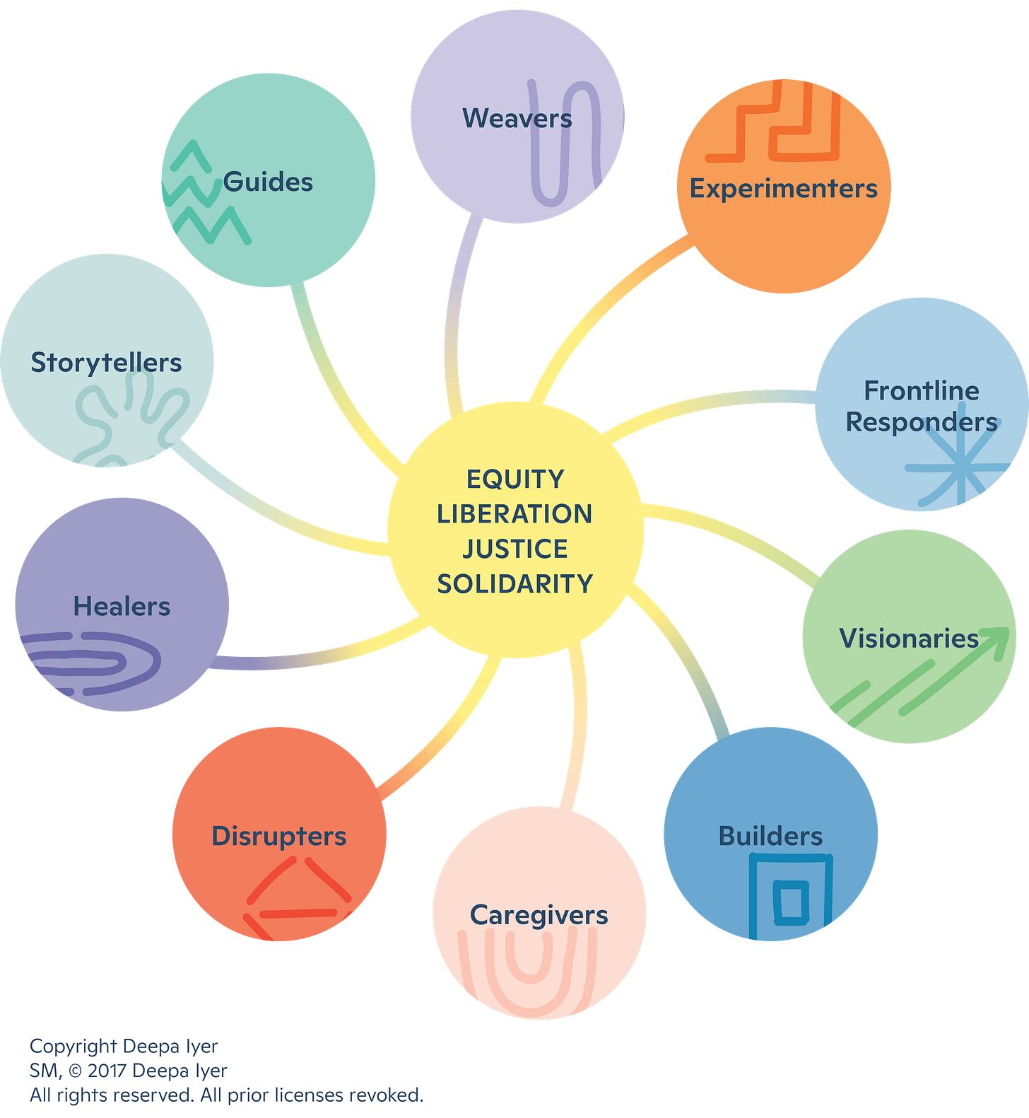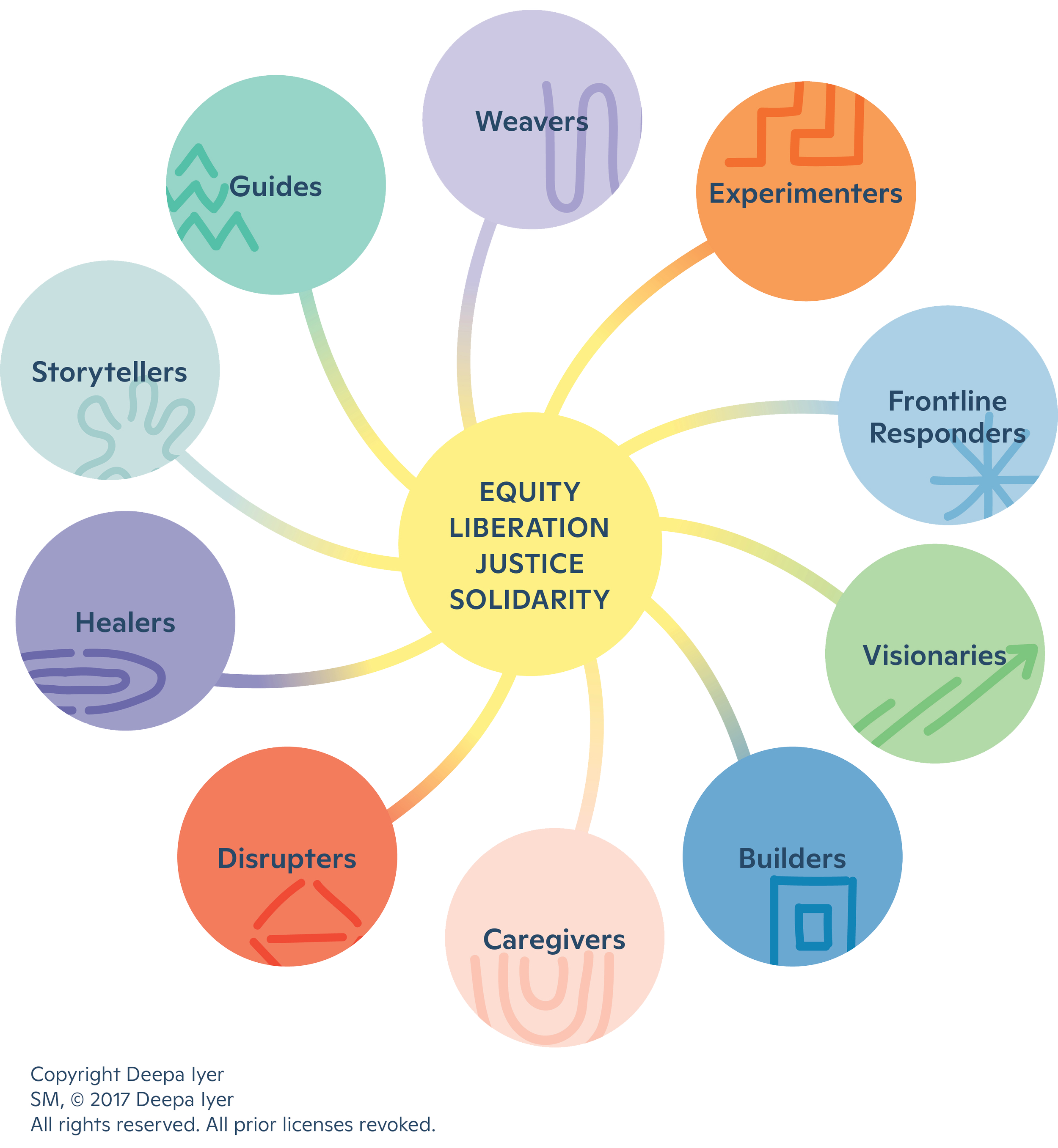 [A helpful way of thinking about this for social movements is the Social Movement Ecosystem developed by Deepa Iyar. There are many different functions and roles that need to happen for successful movements, and one person can not do it all. An individual might find themselves playing more than one of these roles, but not all of them. But ultimately, everyone together fills them all. See also ]